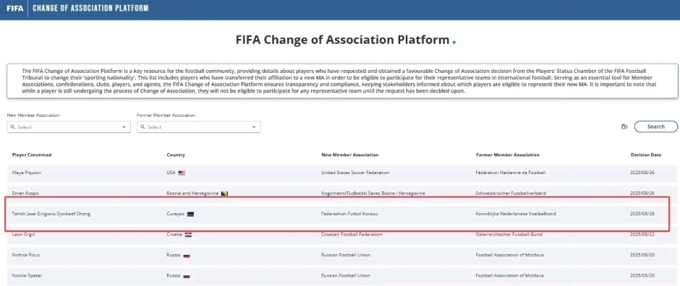 北京时间8月27日,国际足联球员会籍变更系统显示,25岁的华裔球员陈达毅(Tahith Chong)已经从荷兰足协转换到库拉索足协。这也意味着他正式与中国男足无缘。